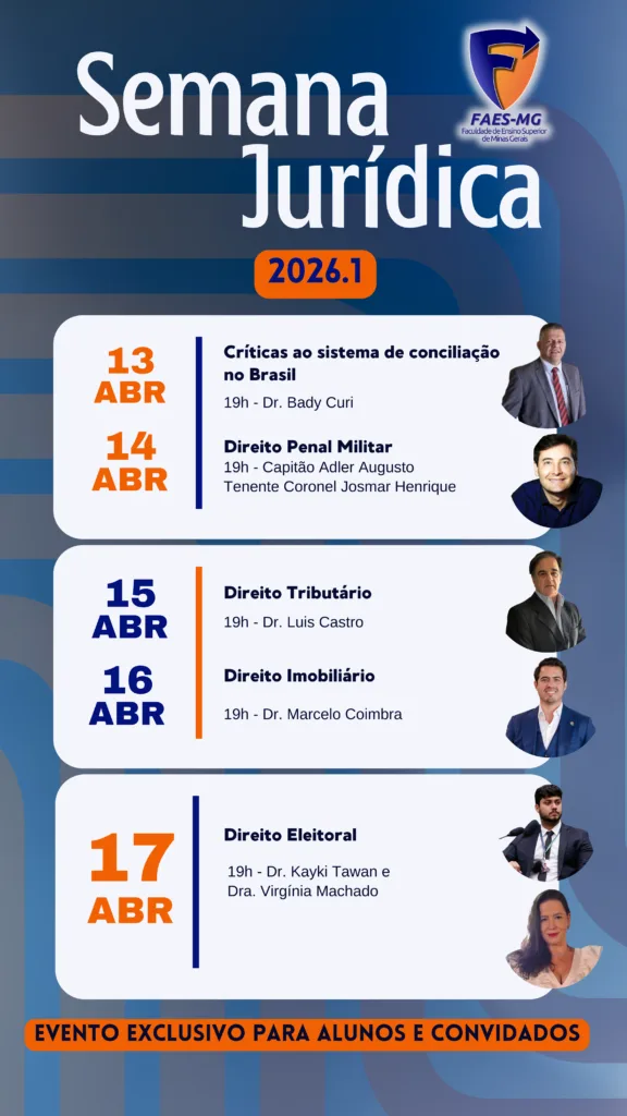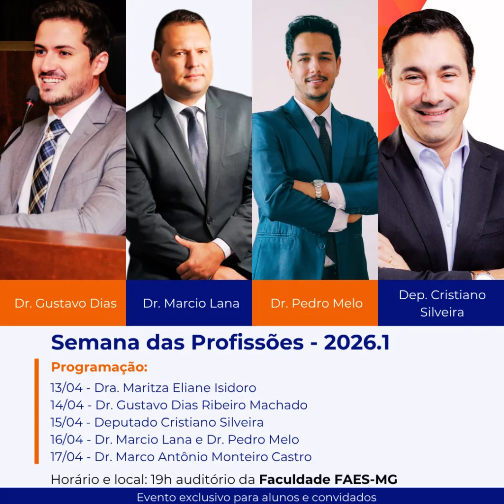 Entre os dias 13 e 17 de abril de 2026, a Faculdade de Ensino Superior de Minas Gerais – FAES-MG realizará a Semana de Profissões, voltada aos alunos do 1º período, e a Semana Jurídica, destinada aos alunos do 2º período do curso de Direito. Durante o evento, os estudantes terão contato direto com profissionais e autoridades do meio jurídico mineiro, por meio de palestras, seminários e debates que abordarão tanto as diversas carreiras jurídicas quanto temas atuais e relevantes do Direito, proporcionando uma visão prática e estratégica da atuação profissional.